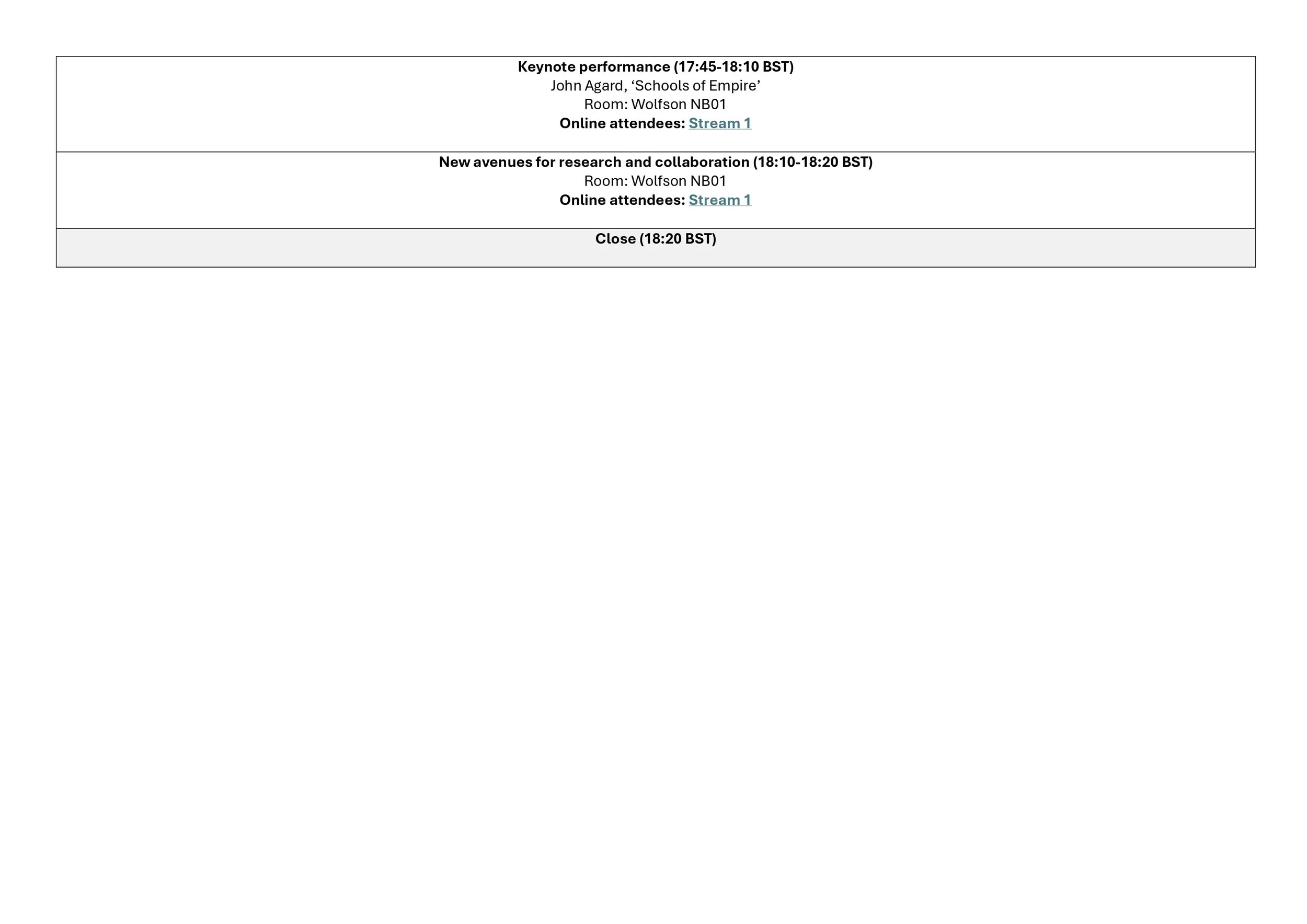 In-person participation is limited to workshop speakers, but all strands, the keynote lecture (Prof. Catherine Hall) and the keynote performance (John Agard) will be live-streamed on the day free of charge via the Zoom links below. Please note that papers will not be recorded and Q&A will be limited to in-person participants only.